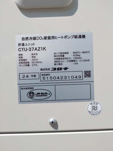 施工事例:市川市 コロナ自然冷媒CO2家庭用ヒートポンプ給湯機 貯湯ユニットCTU-37AZ1K、ヒートポンプユニットCHP-DZ451K エコキュート交換工事