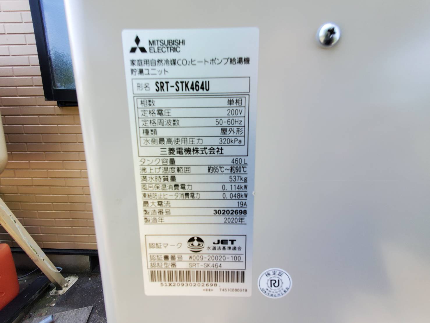 施工事例:船橋市三菱電機家庭用自然冷媒CO2ヒートポンプ給湯器貯湯ユニットSRT-STK464U